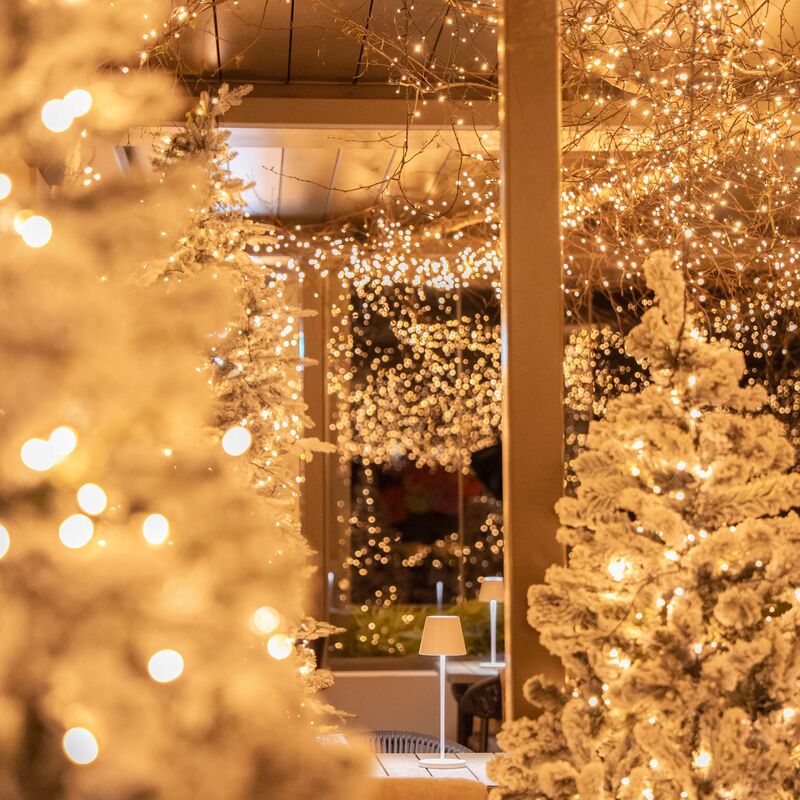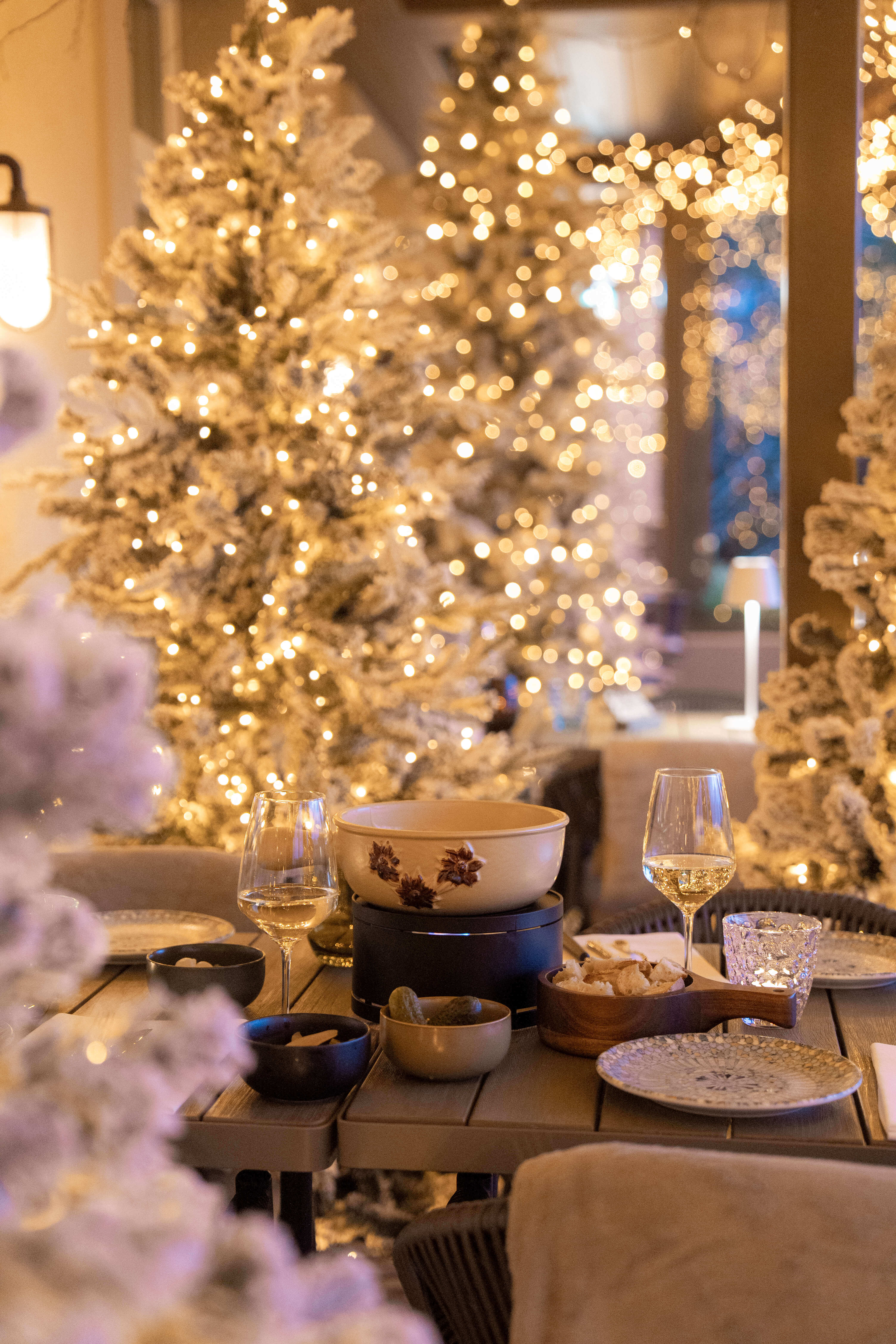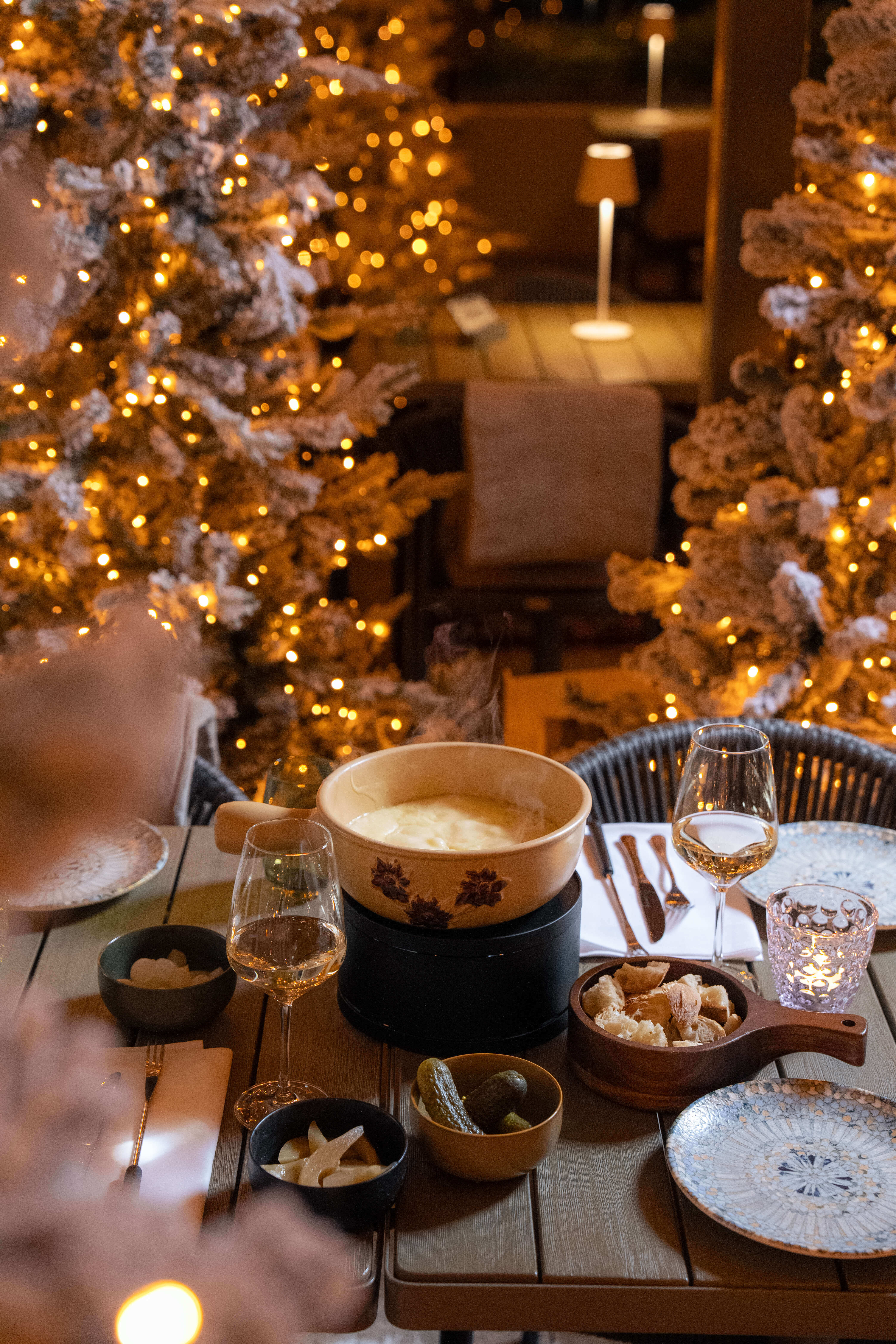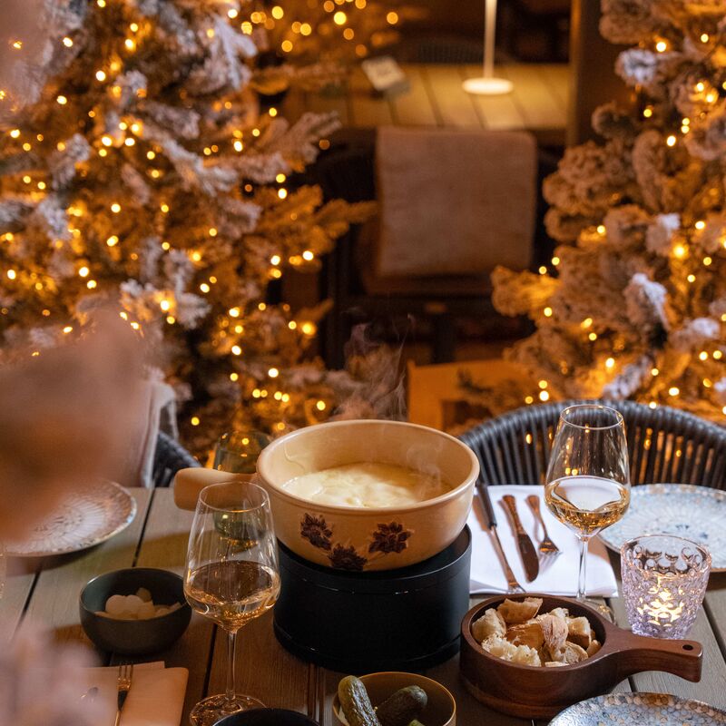 Jetzt ist es auf unserer gedeckten Terrasse besonders kuschelig. Geniessen Sie ein hervorragendes Käsefondue inmitten von Tannenbäumen und Lichterketten, mit Blick auf die Reuss,