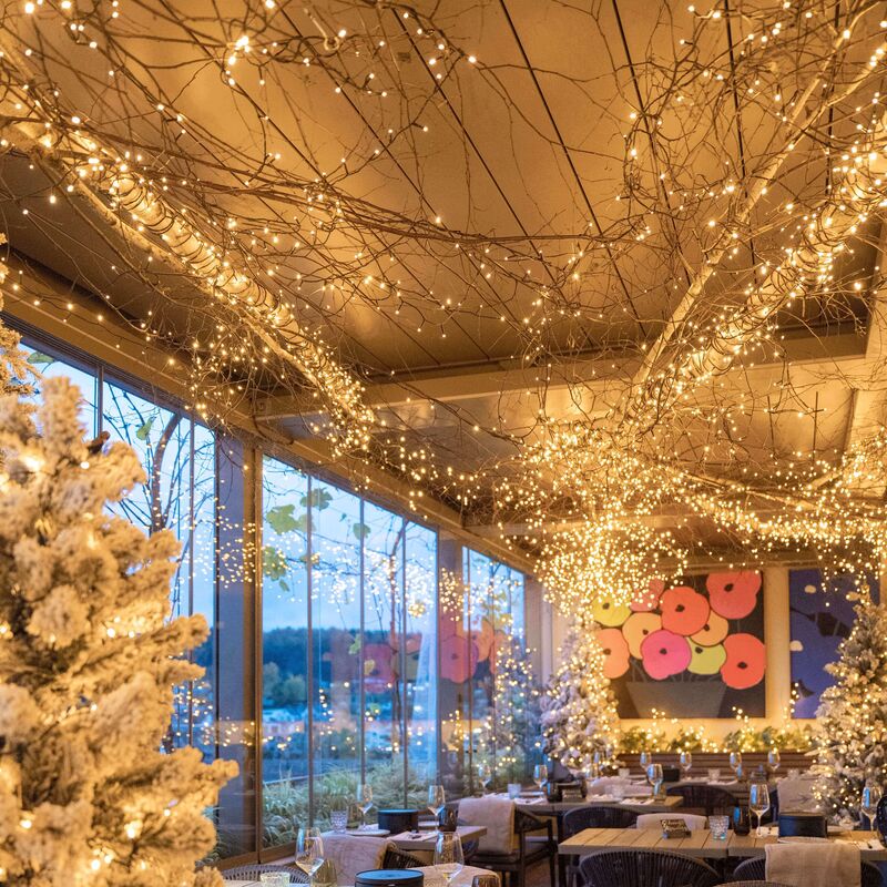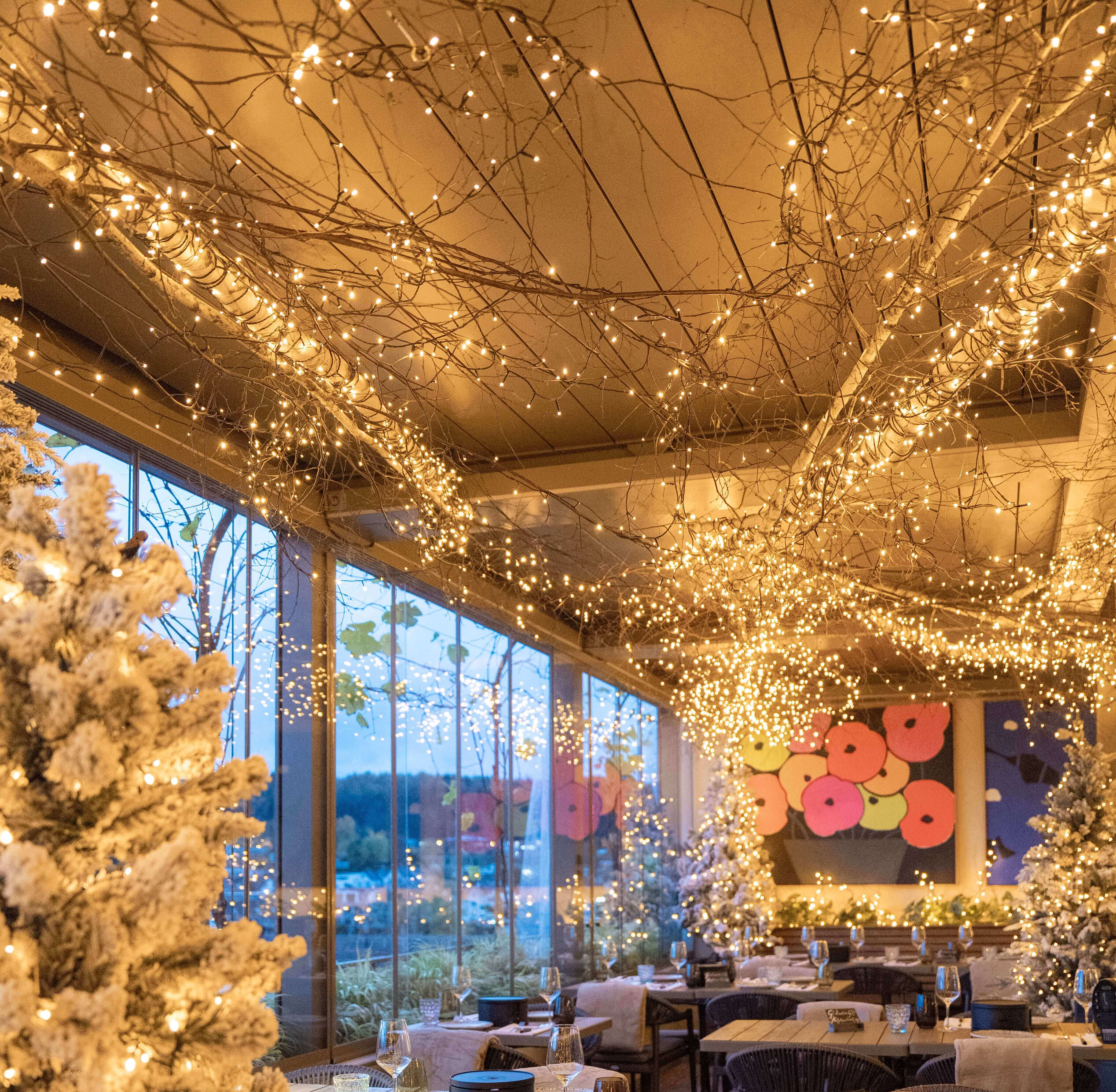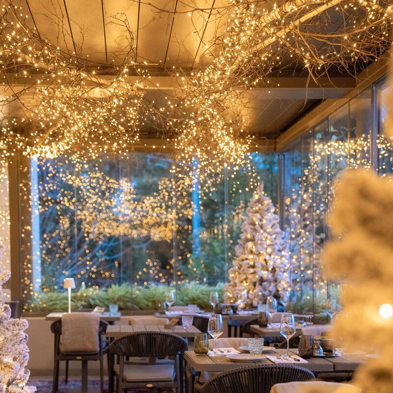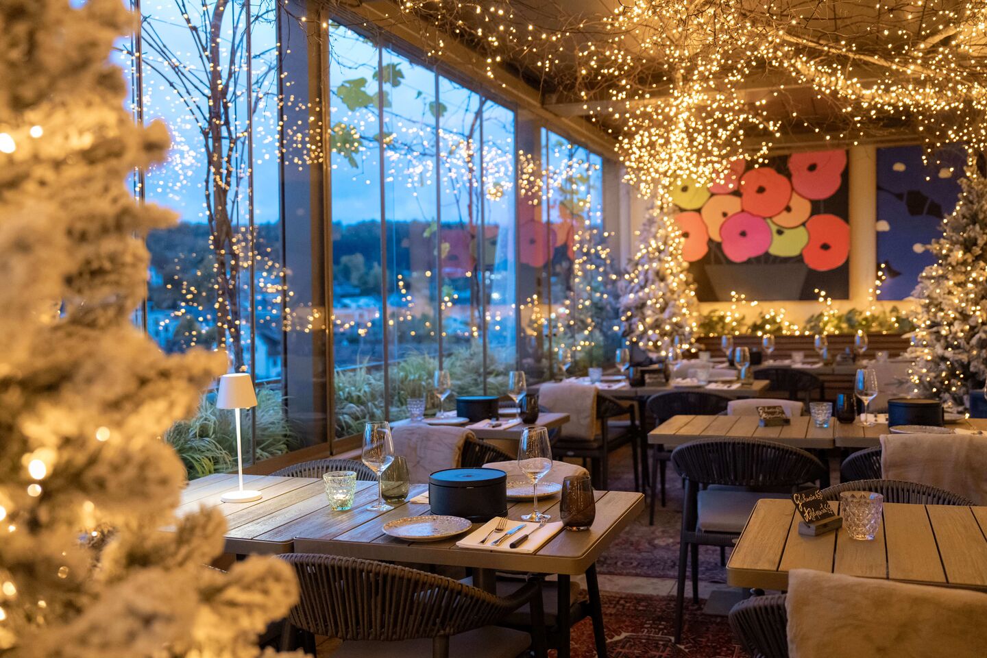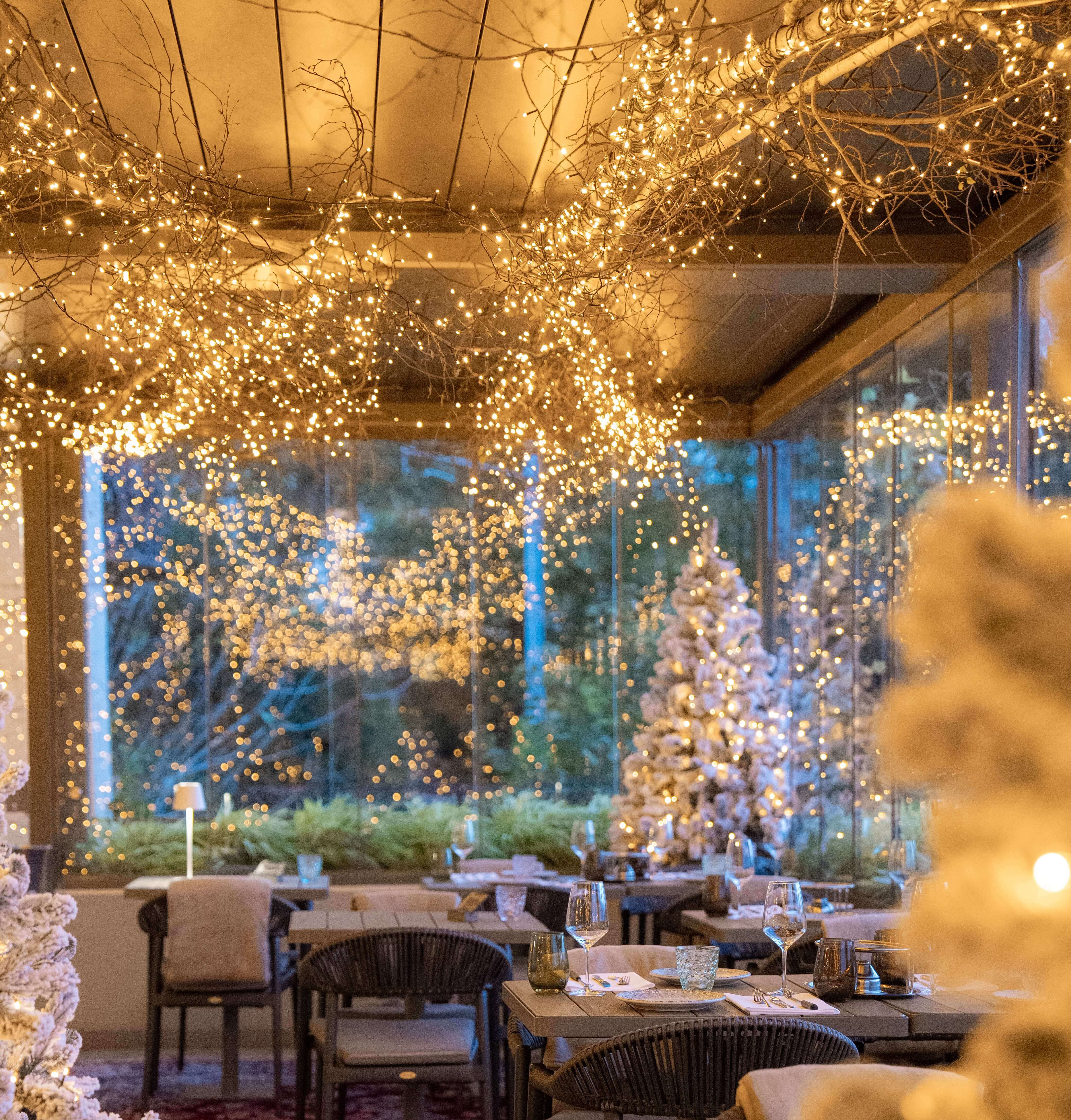 Jetzt ist es auf unserer gedeckten Terrasse besonders kuschelig. Geniessen Sie ein hervorragendes Käsefondue inmitten von Tannenbäumen und Lichterketten, mit Blick auf die Reuss,